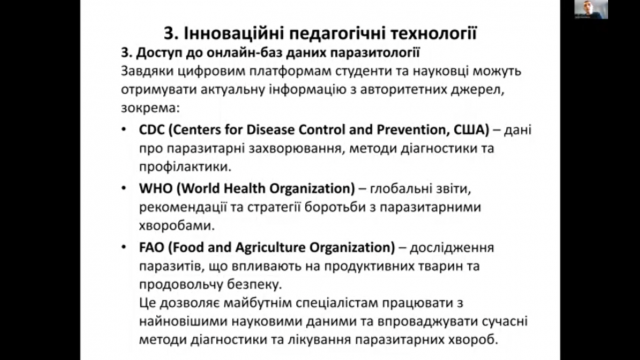 - Сучасні підходи до викладання дисципліни «Паразитологія та інвазійні хвороби тварин». Ця дисципліна є важливою складовою ветеринарної медицини, тому методи її викладання повинні постійно оновлюватися. Особливу увагу приділено використанню мультимедійних та інтерактивних методів навчання, що дозволяють глибше занурити студентів у проблему паразитарних інфекцій та їх впливу на здоров'я тварин.