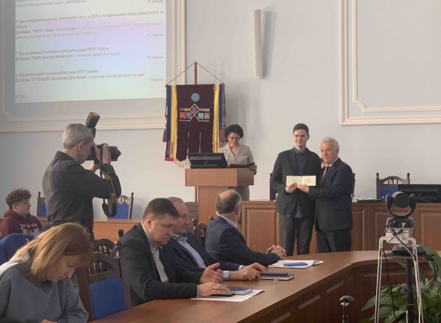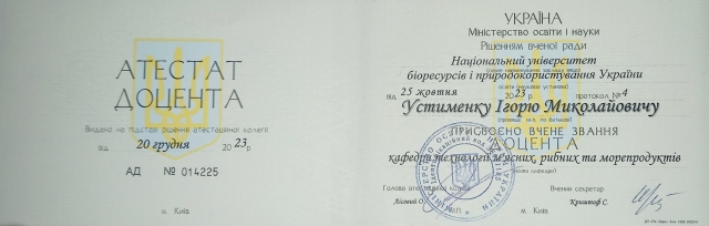28 лютого 2024 року на засіданні Вченої ради Університету, перед початком розгляду питань порядку денного, ректор Національного університету біоресурсів і природокористування України, доктор педагогічних наук, професор, академік Національної академії педагогічних наук України та Національної академії аграрних наук України України Станіслав Ніколаєнко вручив атестати професора та доцента науково-педагогічним працівникам. Серед них викладач кафедри технології м’ясних, рибних та морепродуктів Ігор Устименко.