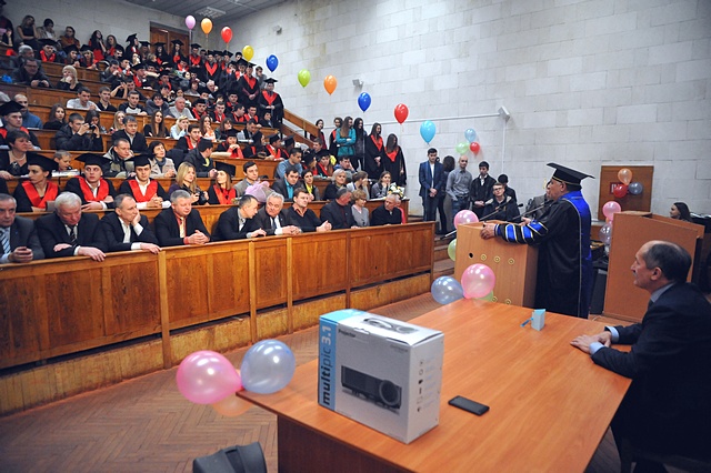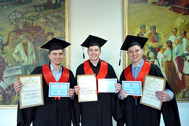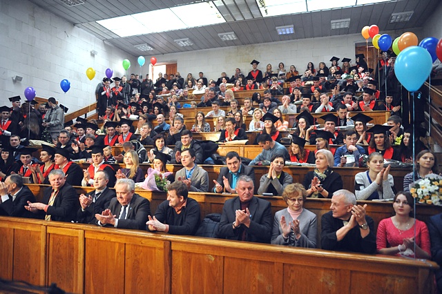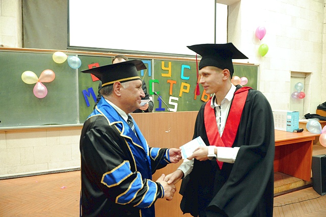 І ось довгоочікувана хвилина – на трибуну вийшов декан В.О. Забалуєв для вручення дипломів кожному випускникові. Перш за все, він привітав усіх із закінченням навчання, у напутньому слові наголосив на важливості постійної праці над собою й бережному ставленні до людських цінностей. Перше декан відзначив найактивніших студентів, які приймали участь у спортивному, культурному й громадському житті факультету, нагородивши їх грамотами. А далі вручення дипломів. Тепер 96 дипломованих фахівців під оплески й вітання вийшли у життя, щоб реалізувати себе, щоб пробивати собі дорогу в самостійному житті, щоб працювати задля блага свого, своєї сім’ї, своєї прекрасної України.