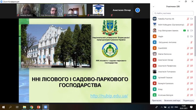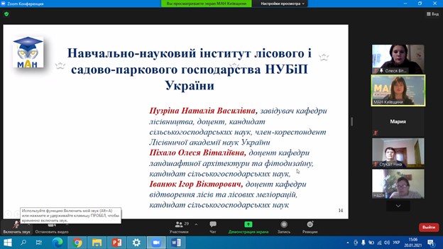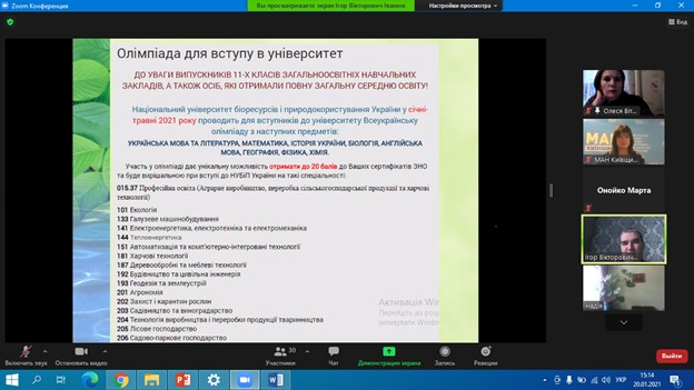 Щорічно профорієнтаційну роботу викладачі інститут ННІ лісового і садово-паркового господарства проводять з учнівською молоддю – членами Малої академії наук. Карантин не став на заваді і цьогорічним зустрічам. Так 20 січня 2021 року в он-лайн режимі Ігор Іванюк, Наталія Пузріна та Олеся Піхало зустрілися з учнями-членами наукового відділення екології та аграрних наук Київського обласного територіального відділення МАН України. Організаторами зустрічі були Департамент освіти і науки Київської обласної державної адміністрації; Київський обласний комунальний позашкільний навчальний заклад «Мала академія наук учнівської молоді» та Навчально-науковий інститут лісового і садово-паркового господарства Національного університету біоресурсів і природокористування України.