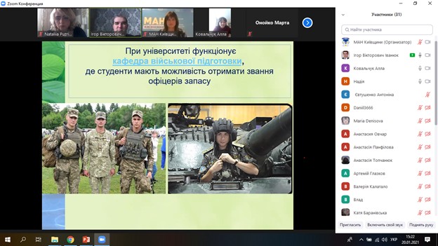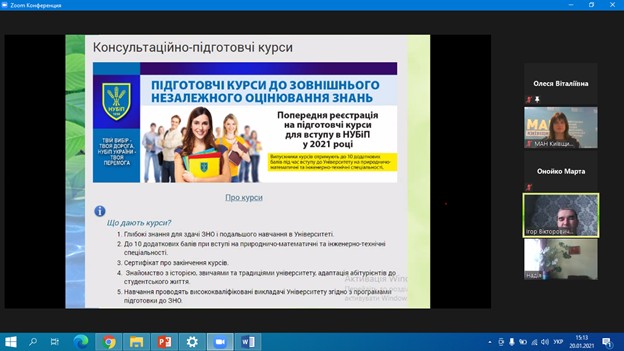 Співробітники Навчально-наукового інституту лісового та садово-паркового господарства розповіли слухачам Малої академії наук про НУБіП, велику цікавість серед учнів викликало запрошення до відвідування Музею лісових звірів і птахів ім. професора Салганського О.О. та Ботанічного саду НУБіП. Також учнів було проінформовано про олімпіаду та особливості вступу 2021 року.