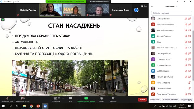 Олеся Піхало надала учням інформацію та поради щодо написання наукових робіт в лекції «Садово-паркове будівництво. Формування декоративних насаджень в урбогенних умовах». Відзначила актуальність та важливість робіт, які присвяченні садово-парковому господарству. Звернула увагу на актуальність обрання тематик для наукових робіт, поетапність виконання роботи, аналіз існуючих даних, нормативно-правову базу та проектні рекомендації на території дослідних об’єктів. Розповіла про основні креслення та проекти, які пов’язані із темами щодо реконструкції парків-пам’яток садово-паркового мистецтва, проектних рішень територій та вивчення стану насаджень на об’єктах різного функціонального призначення.