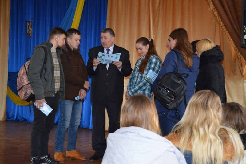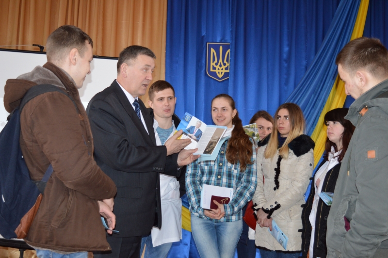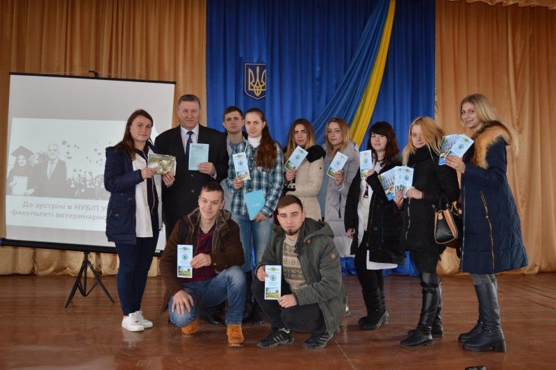 Данілов В.Б. представив презентацію про НУБіП України та факультет ветеринарної медицини і, зокрема, наголосив, що у цьому році виповнюється 120 років з дня заснування університету, а через два роки факультет ветеринарної медицини буде святкувати 100-річний ювілей. Ним були роздані буклети університету та факультету, правила прийому до НУБіП України, брошури щодо навчання на військовій кафедрі університету, студентську газету факультету «PUNCTUM OPTIMUM», календарики тощо. У своєму виступі Василь Данілов підкреслив, що у 2018 році набір на навчання за спеціальністю «Ветеринарна медицина» на базі молодшого спеціаліста ветеринарної медицини буде проводитись за освітнім ступенем «Бакалавр» та «Магістр».
