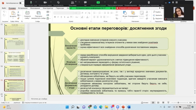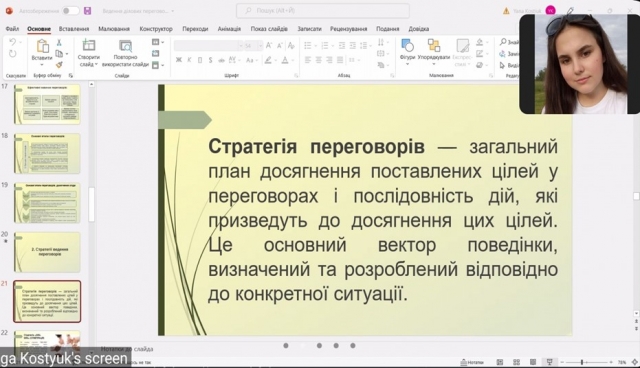 27 квітня 2022 року в онлайн форматі на платформі «Zoom» у відповідності до виконання наказу ректора «Про підвищення якості навчання в НУБіП України» та згідно графіку проведення відкритих занять відбулася лекція кандидата економічних наук, доцента кафедри адміністративного менеджменту та ЗЕД Костюк Ольги Дмитрівни з дисципліни "Діловий протокол та ведення переговорів" для студентів ОС «Бакалавр» ОПП «Маркетинг» спеціальності 075 «Маркетинг» на тему «Ведення ділових переговорів».