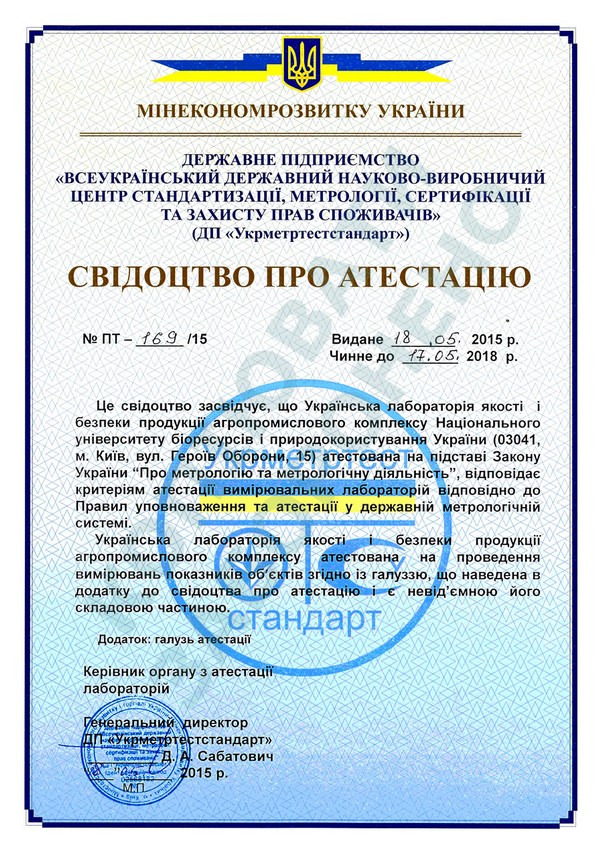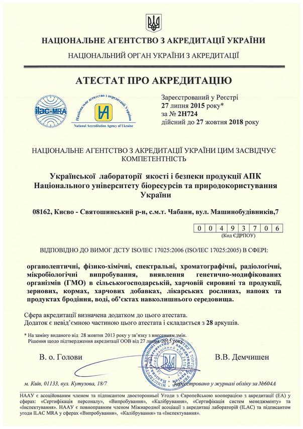 Української лабораторії якості і безпеки продукції АПК акредитована Національним агентством з акредитації України у відповідності до вимог ДСТУ ISO/IEC 17025:2006. Політика у сфері якості лабораторії передбачає науково-методичний супровід діяльності з управління якістю та безпечністю харчової продукції, сільськогосподарської сировини та об`єктів навколишнього середовища, аналізу ризиків АПК, шляхом випробування, експертизи. Моніторингу продукції в ланцюгу «від поля до столу»,що створює умови для формування ринку безпечної та якісної продукції для українського споживача.