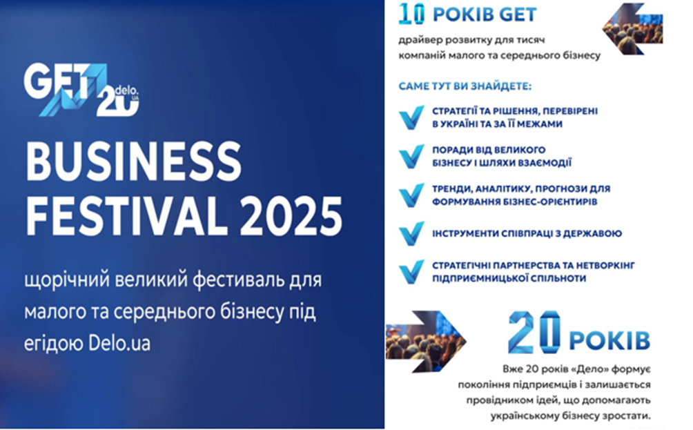 "GET BUSINESS FESTIVAL 2025" – це широковідомий бізнес-формат форуму, який об’єднав понад 90 спікерів та 1500 учасників і проводиться щорічно уже понад 10 років під егідою ділового медіа партнера Delo.ua.