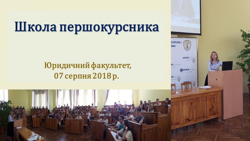Школа першокурсника уже стала традиційним заходом у НУБіП України. 07 серпня 2018 року вона розпочалася із взаємного знайомства цьогорічних вступників із керівництвом юридичного факультету. Із вітальним словом виступила очільниця факультету Олена Яра, яка привітала присутніх із успішним вступом, розказала про історію факультету та його традиції, озвучила головні напрями співпраці студентства та науково-педагогічного персоналу і висловила сподівання щодо ефективності.