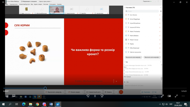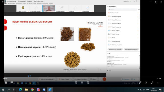 21 вересня 2020 р. було проведено практичне онлайн-заняття, під час якого студенти з дисципліни «Дієтологія і утримання дрібних домашніх тварин» вивчали головні характеристики промислових кормів для собак і котів. Заняття було організовано доцентом кафедри терапії і клінічної діагностики Наталією Бойко в онлайн-режимі за допомогою платформи Cisco Webex Meetihg за практичної допомоги компанії «Рояль Канін Україна».