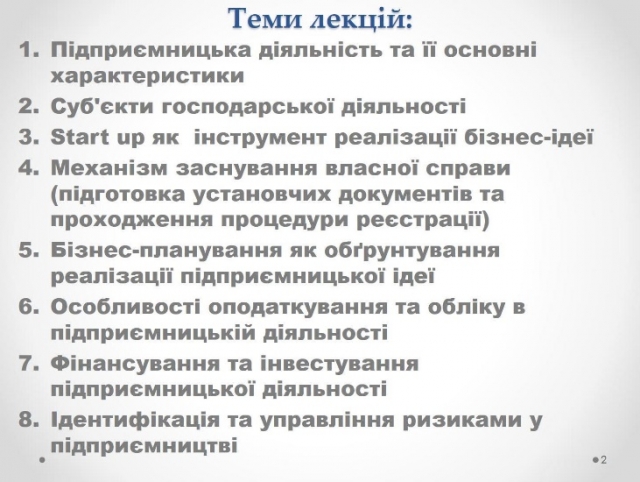 Основна частина лекції була побудована на висвітленні ключових понять в підприємницькій діяльності, принципах і видах підприємництва, умовах та можливостях відкриття власної справи, Doing business в Україні, державному регулюванню підприємницької діяльності.