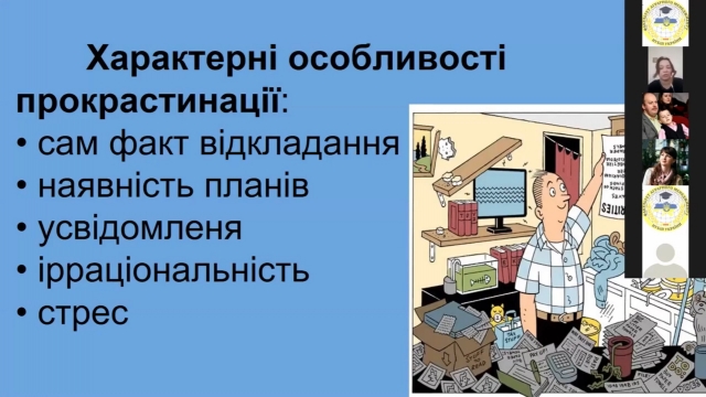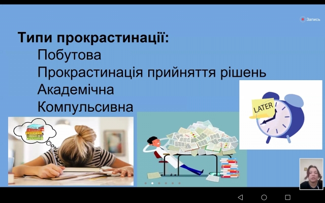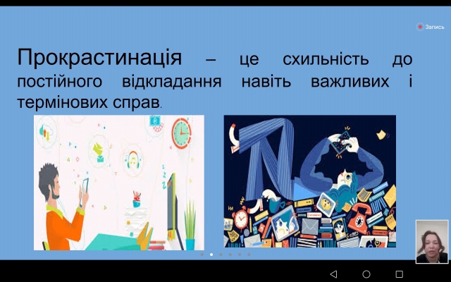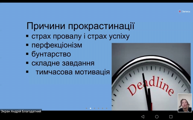 Пані Тетяна, враховуючи актуальність теми для учнівської аудиторії, далі зробила акцент на детальному аналізі явища прокрастинації. Викладач детально пояснила суть, характерні особливості та типи відкладання. Важливим було зрозуміти причини виникнення цього явища, а також усвідомити факт того, що всі ми, в тій чи іншій мірі, прокрастинуємо! З точки зору менеджменту важливо не тільки усвідомлювати проблему, але й знати яким чином її вирішити. Визнання необхідності подолання цього негативного психологічного явища, може зробити життя краще, а перемога над власним прагненням відкласти важливі справи на потім - це ж, по суті, ключ до контролю над своїм життям. Тому на завершення спікер поділилась з аудиторією кількома цікавими методами зменшення впливу прокрастинації.