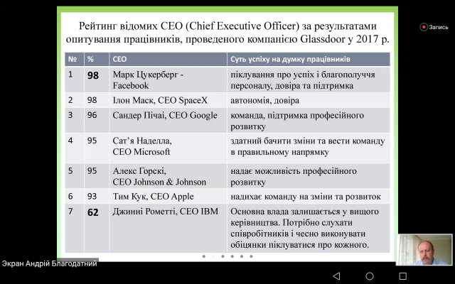 Відмінностей є теж багато. Опираючись на результати опитування працівників успішних компаній щодо характеристики їх топ-менеджерів, яке проводилося компанією Glassdoor у 2017 році, пан Олександр підкреслив, що успіх вищого керівництва описується переважно словосполученнями «довіряє персоналу», «підтримує розвиток», «надихає команду», тобто так, як описується портрет в першу чергу лідера.