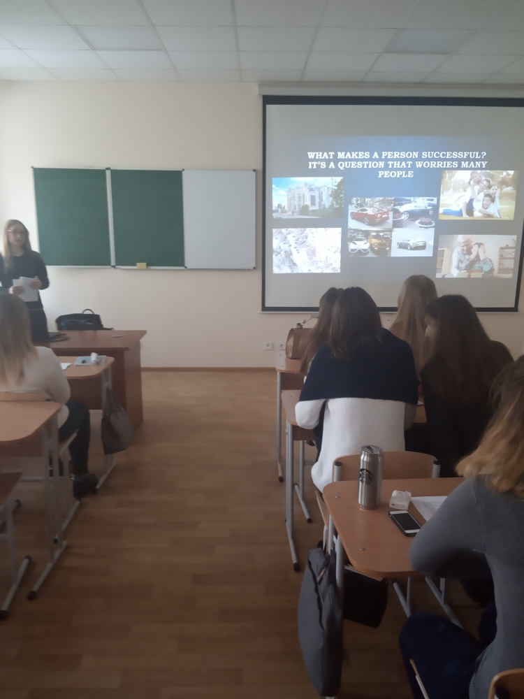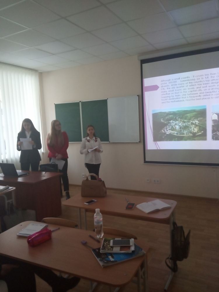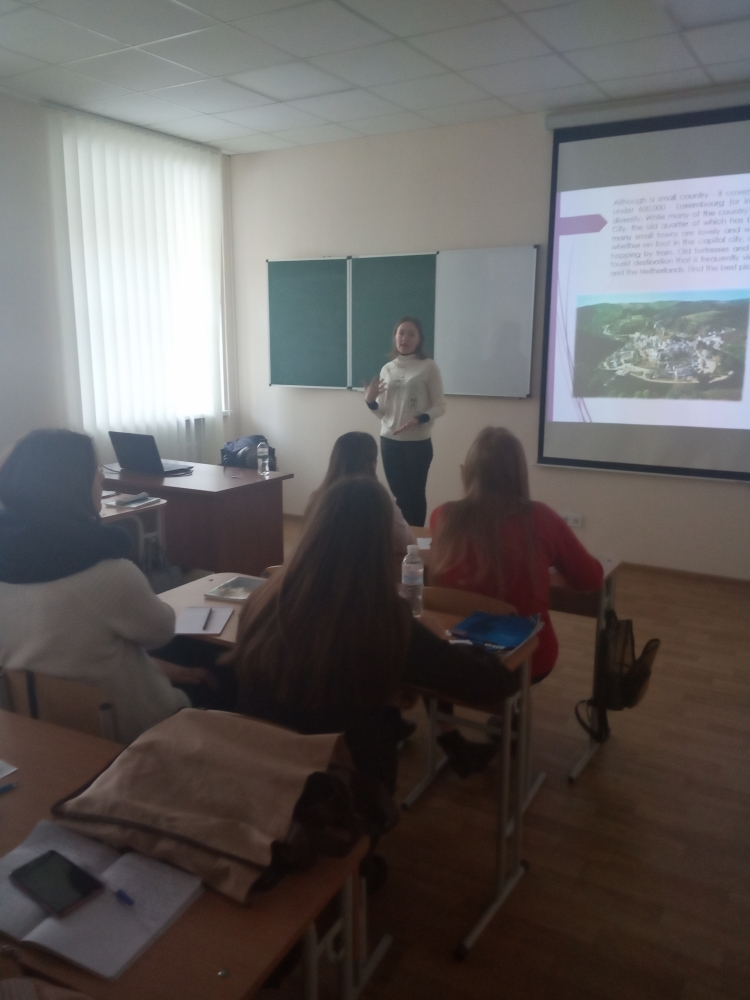 Аліна розповідала першокурсникам про українців за кордоном, можливості розвитку, необхідність вивчення англійської мови, знайомила з європейськими країнами: Люксембург, Франція і Бельгія. Студенти підготували презентації, ставили запитання, дискутували.