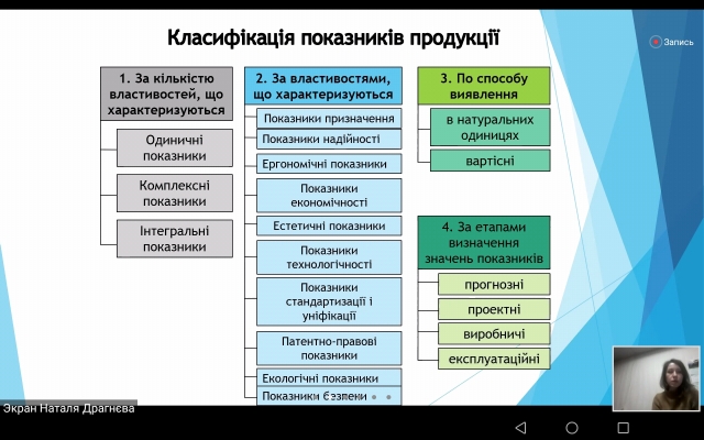 Лектором було систематизовано показники якості за різними класифікаційними ознаками та презентовано учням. Спікером зазначено, що показники якості відіграють важливу інформаційну роль, тобто надають споживачеві інформацію про властивості продукції, використовуються для правильної оцінки рівня якості й допомагають покупцеві зробити відповідний вибір продукції кращої якості.