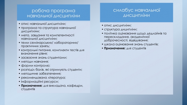 Окремо варто зауважити на питанні співвідношення робочої програми дисципліни та силабусу. Виходячи з роз'яснень представників НАЗЯВО робоча програма – робочий документ кафедри і викладача, що визначає зміст і організацію вивчення конкретної дисципліни, а силабус – це документ, який готується для студента, основна мета якого пояснити студентові суть і форму дисципліни та «правила гри», політику викладача, дедлайни, оцінювання.