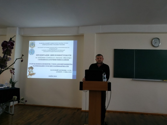 Магістри кафедри стандартизації та сертифікації сільськогосподарської продукції представили свої магістерські дослідження на розгляд екзаменаційної комісії, яка була представлена у складі голови комісії Володимира Пекера (генеральний директор концерну «ТЮФ Рейнланд Групп»), Владислава Сухенка (д.т.н., професор, зав. кафедри стандартизації та сертифікації сільськогосподарської продукції), Лариси Баль-Прилипко (д.т.н., професор, декан факультету харчових технологій та управління якістю продукції АПК), Наталії Сілонової (к.б.н., доцент кафедри стандартизації та сертифікації с.-г. продукції). Секретарем екзаменаційної комісії була призначена Головатюк Галина Степанівна, старший лаборант кафедри стандартизації та сертифікації с.-г. продукції.