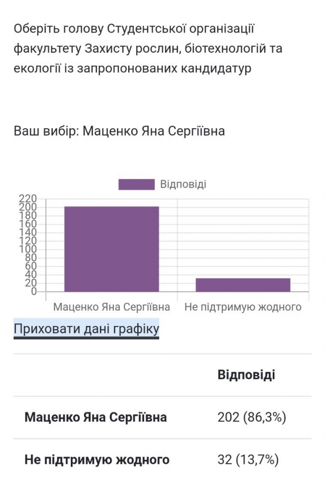 30 вересня на платформі «Elearn» відбулися вибори на посаду голови студентської організації факультету захисту рослин, біотехнологій та екології. Переможницею на посаду голови СО факультету стала Яна Маценко, студентка 3-го курсу, спеціальність «Біотехнології та біоінженерії».