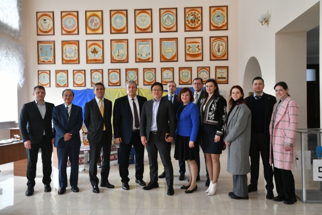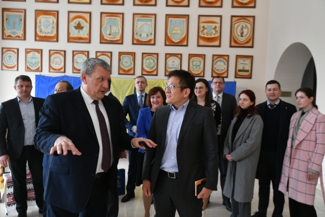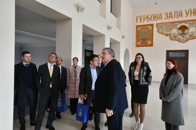 Після теплої зустрічі з Проректором з науково-педагогічної роботи, міжнародної діяльності та розвитку Вадимом Ткачуком, на якій було обговорено шляхи подальшої співпраці, члени японської делегації у супроводі проректора з науково-педагогічної роботи Оксани Тонхи оглянули принади нашої Alma-matir.