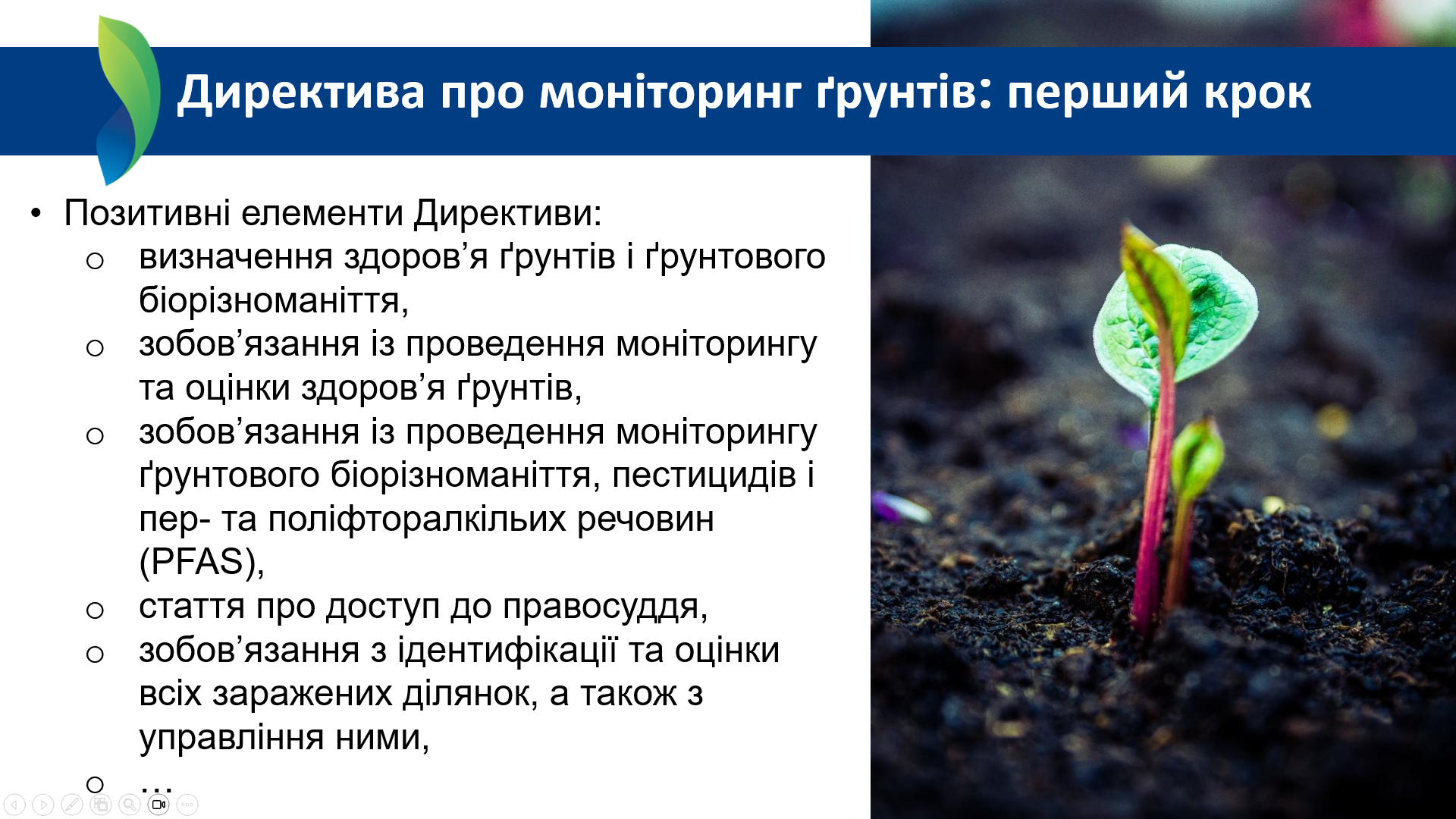 Окрема частина виступу була присвячена необхідності осмислити Директиву не як «вимогу робити більше аналізів», а як інструмент реформування системи регулювання землеустрою. Ідеться про включення критеріїв ґрунтового здоров’я до документів просторового та містобудівного планування, землеустрою, процедур консолідації земель, а також до аграрної політики на рівні інструментів підтримки виробників. Україна має сформувати таку систему планування та дозвільних процедур, яка б реально захищала ділянки з високоякісними та екологічно цінними ґрунтами від необґрунтованої забудови, зберігала їхні екосистемні функції та біорізноманіття, а також створювала економічні стимули для власників і інвесторів орієнтуватися на довгострокове збереження ґрунтового капіталу.