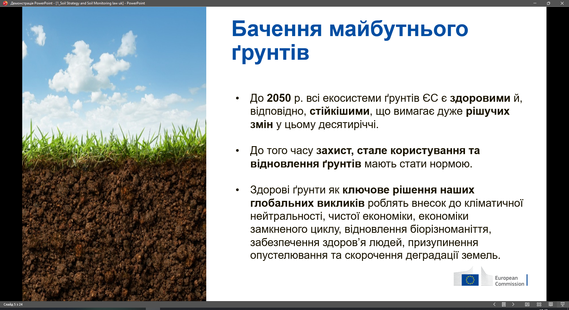 Обговорення було присвячене насамперед імплементації нової політики Європейського Союзу щодо ґрунтів. Йдеться про Європейську стратегію щодо ґрунтів до 2030 року (EU Soil Strategy for 2030), ухвалену Європейською Комісією у листопаді 2021 року, яка ставить амбітну мету — забезпечити до 2050 року здоровий стан усіх ґрунтових екосистем ЄС і надати ґрунтам рівень правового захисту, співмірний із захистом води, повітря та морського середовища. Логічним розвитком цієї стратегії стала пропозиція Директиви Європейського Парламенту та Ради про моніторинг і стійкість ґрунтів (Soil Monitoring and Resilience Directive, COM(2023) 416 final), подана 5 липня 2023 року. У 2024–2025 роках документ пройшов перше читання в Європейському Парламенті, отримав загальний підхід Ради ЄС, а 10 квітня 2025 року інституції досягли політичної домовленості щодо остаточного тексту. У жовтні 2025 року Директиву було схвалено Європейським Парламентом, а Рада офіційно її затвердила як першу в історії ЄС рамкову норму, присвячену саме ґрунтам.