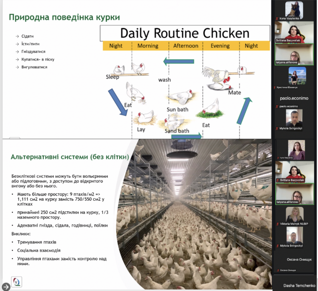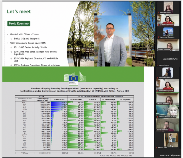 У сучасному освітньому середовищі ефективність навчання майбутніх фахівців значною мірою залежить від вибору методів викладання. Для здобувачів ОС «Магістр» особливо важливо забезпечити не лише академічну глибину, а й прикладну цінність знань. Саме тому активне впровадження лекції-діалогу, лекції-візуалізації, а також бінарних лекцій і практичних занять стає невід’ємною частиною якісного навчального процесу. Гостьові лектори — це фахівці з успішним досвідом роботи у своїй галузі: представники бізнесу, міжнародних компаній, сертифікаційних органів, фермерських господарств тощо. Вони не лише діляться знаннями, а й допомагають студентам побачити, як теорія втілюється у практику. Гостьові лекції мотивують студентів, сприяють професійній орієнтації, дозволяють налагодити зв’язки з потенційними роботодавцями, показують приклади успішного впровадження теоретичних знань у реальній практиці. У рамках вивчення вибіркової дисципліни «Технологія органічного виробництва продукції тваринництва», яка викладається на факультеті тваринництва та водних біоресурсів, до навчального процесу було залучено лекторів з вітчизняним та міжнародним досвідом роботи у галузі тваринництва. Студенти мали унікальну можливість долучитися до лекцій та практичних занять, які провели фахівці-практики з провідних вітчизняних і європейських компаній та організацій. При розгляді теми «Органічне птахівництво» відбулася бінарна лекція за участі Пауло Еконімо, регіонального директора по країнах СНД Vencomatic Group B.V. (Нідерланди). Лектор поділився аналітичною інформацією про масштаби виробництва органічної продукції у країнах Європейського Союзу, зокрема щодо кількості сільськогосподарських тварин, утримуваних за органічною системою. Особливу увагу він приділив сучасним технологічним рішенням, які розробляє компанія Vencomatic Group B.V. Було представлено обладнання, придатне для використання у птахівничих господарствах, що працюють відповідно до вимог органічного виробництва, з акцентом на комфорт, біобезпеку та дотримання благополуччя птиці. Тетяна Аліфанова, регіональний менеджер з розвитку бізнесу компанії Vencomatic Group B.V., зосередила увагу на обладнанні, призначеному для вольєрного утримання курей-несучок. Вона детально розповіла про конструктивні особливості систем, які відповідають вимогам органічного птахівництва, зокрема щодо простору для вільного пересування птиці, облаштування зон для гніздування, годівлі та відпочинку. Такі рішення сприяють дотриманню принципів благополуччя тварин, дозволяють ефективно організувати виробничий процес і, водночас, забезпечують високу якість продукції. Пані Тетяна також наголосила, що прикладом успішного впровадження такого обладнання в Україні є ТОВ «Либідь-К» — сертифікований органічний виробник курячих яєць. Господарство використовує рішення компанії Vencomatic Group B.V. для вольєрного утримання курей-несучок, що дозволяє не лише дотримуватися вимог органічного виробництва, а й забезпечувати стабільну якість продукції.