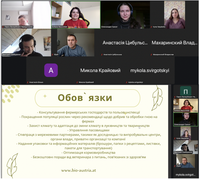 До проведення практичного заняття за темою «Основні принципи виробництва молока і м’яса за органічного виробництва» була залучена Олександра Гранат, випускниця факультету тваринництва та водних біоресурсів, яка наразі працює головним технологом на фермерському господарстві закритого типу «Figerhof», розташованому в гірській місцевості Східного Тіролю (Австрія). Основним напрямом роботи господарства є виробництво козиного молока та молочної продукції. Крім того, Олександра проходить стажування в офісі «Ziegen Land» — асоціації з розведення та утримання кіз Верхньої Австрії, яка об'єднує, координує та надає сервісну підтримку як органічним, так і традиційним фермерським господарствам. Як зазначає сама фахівчиня, тема органічного фермерства є їй особливо близькою, адже більше 27% усього фермерства в Австрії належить до органічного сектору. Під час заняття Олександра поділилася особливостями виробництва органічної продукції в Австрії загалом, звернувши увагу на нормативні вимоги, систему сертифікації та державну підтримку органічних господарств. Особливий акцент вона зробила на практичних аспектах ведення органічного козівництва, розповівши про стандарти утримання тварин, вимоги до кормової бази, підходи до ветеринарного обслуговування та виробництва якісної молочної продукції. Завдяки реальному досвіду роботи на фермі та у профільній асоціації, її виступ став цінним джерелом знань для здобувачів освіти, які зацікавлені в розвитку органічного тваринництва в Україні.