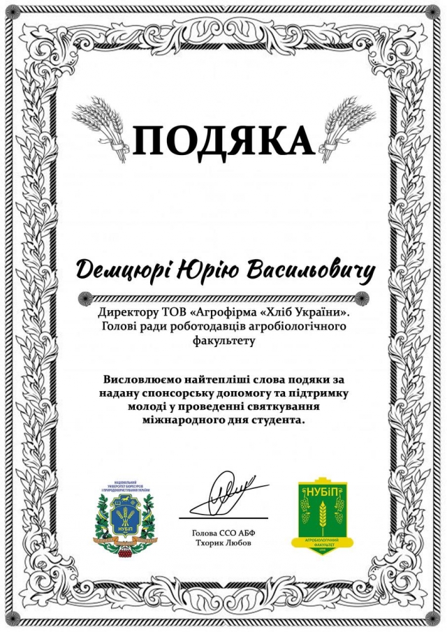 Від імені Сенату студентської організації Агробіологічного факультету хочемо привітати Вас з прийдешнім Днем працівника сільського господарства.