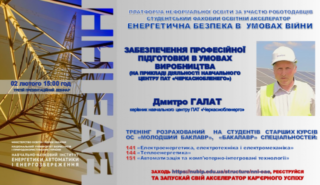 Спікер вебінару, директор навчального центру ПАТ «Черкасиобленерго» Дмитро Галат, досвідчений фахівець у сфері електричної інженерії, має понад 30 років стажу у сфері надання освітніх послуг, випускник ННІ енергетики, автоматики і енергозбереження НУБіП України.
