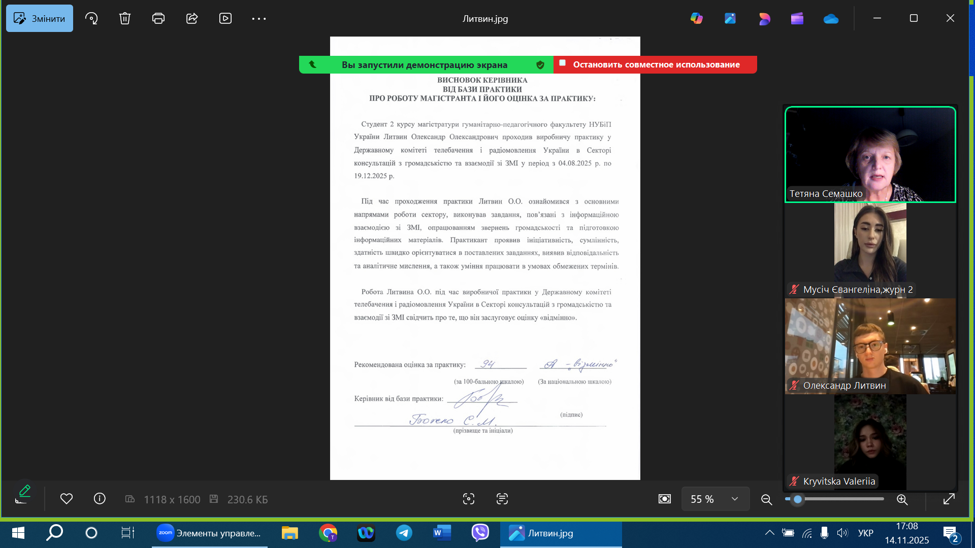 Онлайн-захист пройшов у конструктивній атмосфері. Керівник практики від університету професор Тетяна СЕМАШКО високо оцінила якість практичного навчання магістрів: фаховий ріст студентів, відповідальність і системність у роботі, творче мислення, готовність працювати з різними форматами контенту, вміння швидко адаптуватися до умов сучасних медіа. Здобувачі вищої освіти отримали змістовні рекомендації щодо вдосконалення власних умінь.