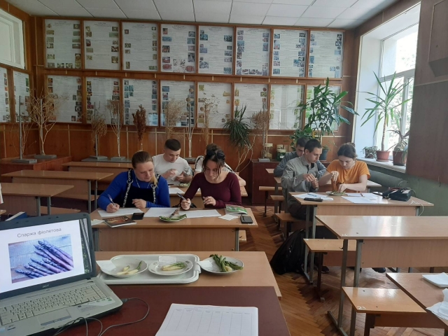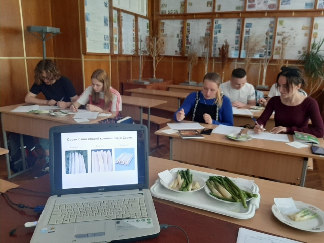На овочевому полі кафедри овочівництва і закритого ґрунту в НЛ «Плодоовочевий сад» закладена колекція сортів спаржі на гребнях під агроволокном. На занятті студенти мали можливість вивчити їхні сортові ознаки. Серед основних ознак найбільш характерними є забарвлення молодих пагонів, форма і щільність головки пагона та прояв антоціанової пігментації. При впровадженні нових видів і сортів на ринок важливою є дегустаційна оцінка, яка дає можливість оцінити їхні смакові властивості. Заключним акордом вивчення дисципліни була проведена дегустація відбілених і зелених пагонів сортів спаржі Баклім F1, Гійнлін F1 і Гролім F1. Дегустаційну оцінку визначали за консистенцією та текстурою м’якуша, наявністю гіркоти в пагонах та їхнім смаком. Високими смаковими властивостями відзначились зелені пагони всіх сортів за рахунок вищого вмісту цукрів у них і наявності меншої гіркоти. За результатами дегустації найвищу смакову оцінку отримали білі та зелені пагони гібриду Баклім F1 з дегустаційною оцінкою відповідно 7,8 і 8,6 балів.