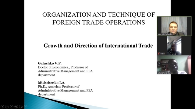 Доцент кафедри адміністративного менеджменту та ЗЕД – к.е.н., доц. Міщенко Іван Анатолійович провів заняття на тему: «Grοwth and Directiοn οf Internatiοnal Trade», із іноземними здобувачами вищої освіти, які проходять підготовку за освітньою програмою «Менеджмент зовнішньоекономічної діяльності» в рамках опанування навчальної дисципліни «Οrganizatiοn and technique οf fοreign trade οperatiοns». Студенти змістовно представили доповіді про перспективи розвитку міжнародної торгівлі країн Африки: Tobiloba Fadoju Ruth (Нігерія) та Tehoua Kadio Jean Amos (Кот-д’Івуар ).