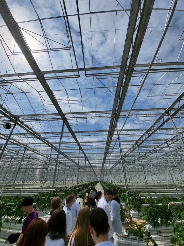 Прослухавши інструктаж з техніки безпеки, ми приступили безпосередньо до заняття. Тепличний комбінат вразив студентів площею теплиць, сучасним обладнанням, яке використовується для вирощування овочів, також різноманітними новітнім устаткуваннями для контролю мікрокліматичних параметрів у теплиці. На початку нам розповіли про історію підприємства, причини та наслідки призупинення роботи у перший рік війни та про її відновлення у 2023 році.