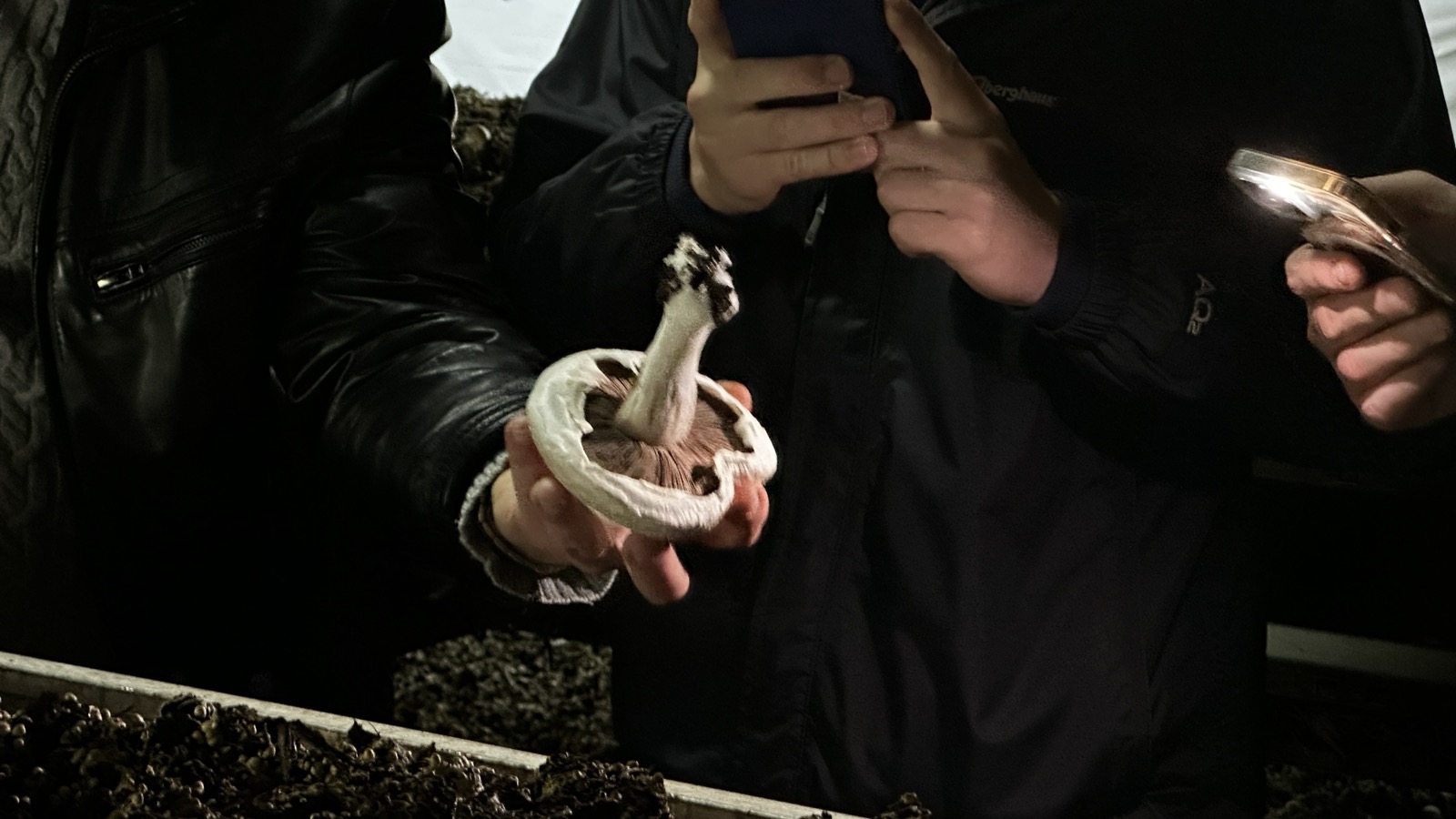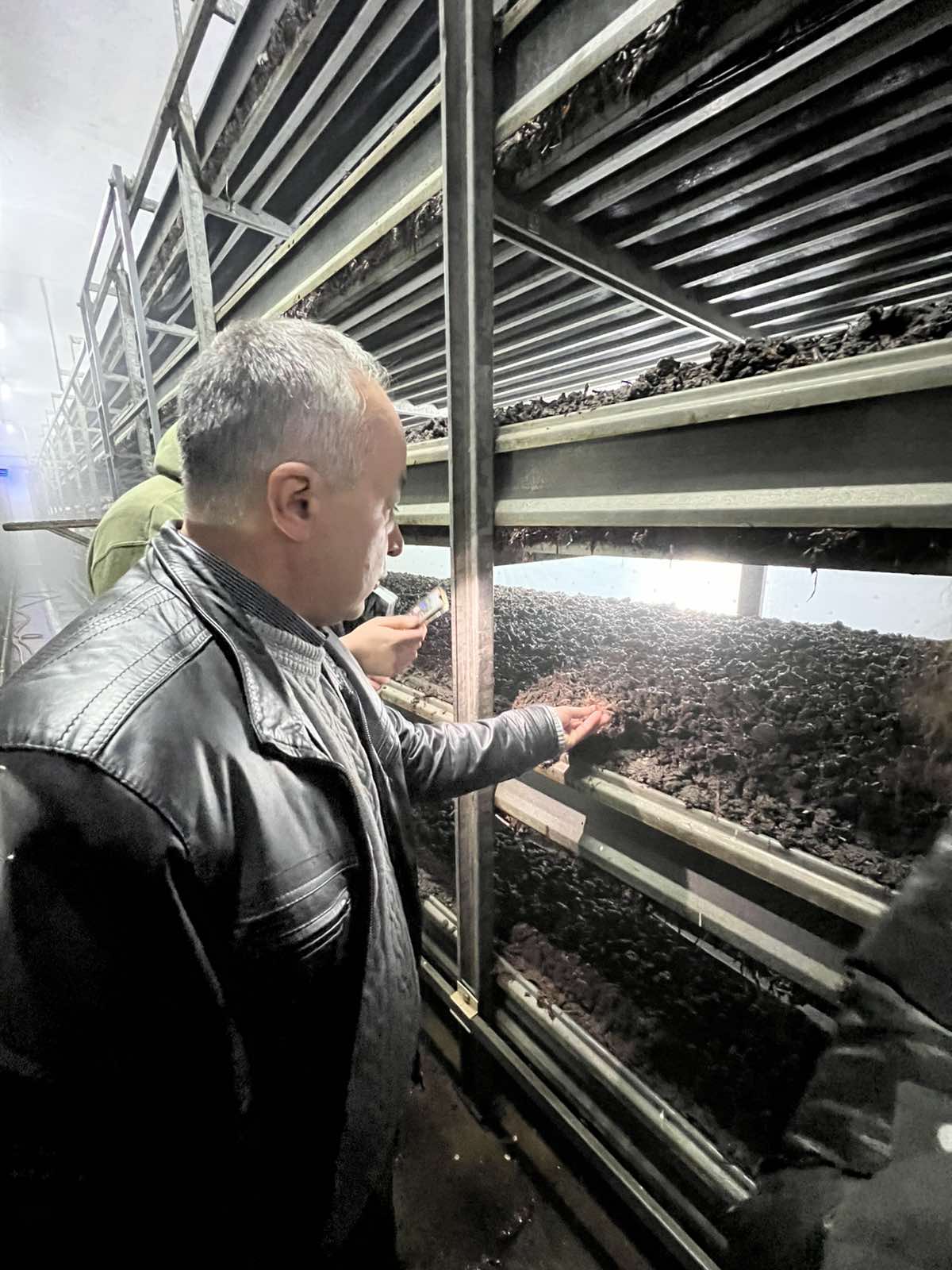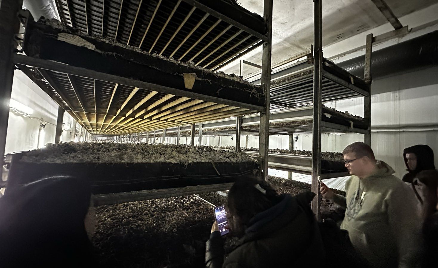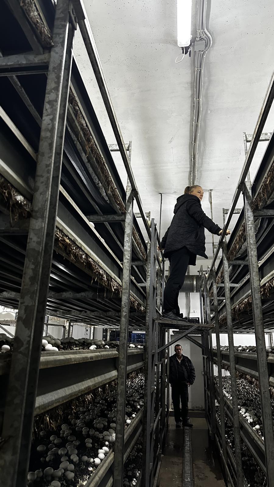 Ми відвідали кілька камер: у першій субстрат був щойно інокульований і покритий торфом (покривна суміш), у наступних проходили перша, друга та третя хвиля плодоношення. Нам показали, як правильно збирати печериці, а саме за методом «одного дотику», щоб не пошкодити шапинку, на якій в подальшому утворюється невеликі вм’ятини.