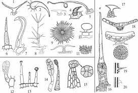 Трихоми епідерми бувають (мал.1): 1-11 — прості волоски: 1 — дворогий; 2 — ретортовидний; 3 — Тподібний; 4 — щетинистий з бородавчастої кутикулою; 5 — бичевидний з витягнутою апікальної клітиною; 6 — багатоклітинний, однорядний, конічний з штрихуватою кутикулою; 7 — чіпкий крючковидний; 8 — гіллястий; 9 — зірчастий (вигляд зверху і збоку); 10 — пухирчастий; 11 — сосочковидні; 12-15 — залозисті волоски: 12 — з одноклітинною ніжкою і багатоклітинною головкою; 13 — з багатоклітинною однорядною, довгою ніжкою і одноклітинною, маленькою головкою; 14, 15 — з багатоклітинною головкою і багатоклітинною одно - та багаторядної ніжкою; 16-21 — емергенці: 16 — пекучий волосок (а — багатоклітинна підставка; б — ампулка; в — головка); 17 — щетинка; 18 — щитковидна, або пельтатна, залозка; 19, 20 — колючка і шип.
