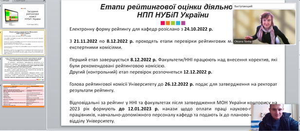 У вступному слові Оксана Тонха вказала на сумлінність відповідальних при заповненні рейтингової електронної форми по кафедрах. Також приділила увагу загальним організаційним моментам, наголосила про всі етапи рейтингової компанії та достовірності подання результатів кожного науково-педагогічного працівника.