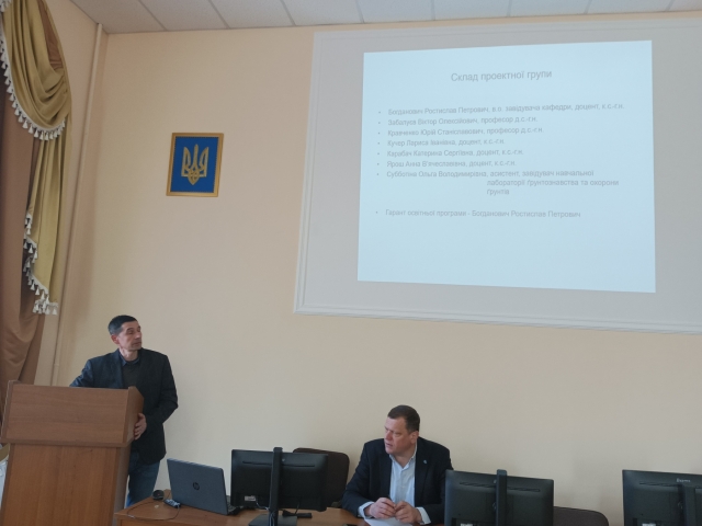 Завідувач кафедри ґрунтознавства та охорони ґрунтів ім. проф. М.К. Шикули Ростислав Богданович доповів про відкриття освітньо-професійної програми «Охорона та технології відтворення ґрунтів» та затвердження гаранта освітньої програми, запропоновано склад робочої групи, зроблена порівняльна характеристика із закордонними аналогами, і вітчизняними дисциплінами у вузах.