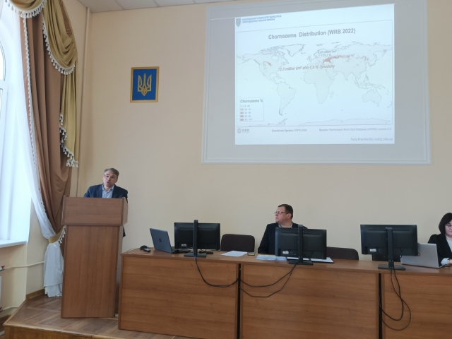 Професор кафедри ґрунтознавства та охорони ґрунтів ім. проф. М.К. Шикули Юрій Кравченко представив наукову доповідь: «Наукові основи дослідження чорноземів України», проінформував присутніх про площі поширення зональних типів ґрунтів, критичні зміним в структурі чорноземів на фоні антропогенної діяльності і кліматичних змін, була представлена порівняльна характеристика дії тривалих обробітків ґрунту, визначено що класичний обробіток сприяє змінам гумусового горизонту, грунт більш інтенсивно піддається процесам нагріванні і охолодження, розмерзання і замерзання, що сприяє накопичення фракцій піску. Окрема увага приділена ролі мікроорганізмів у формуванні гумусових речовин. Доповідь викликала зацікавленість присутніх і жваву дискусію, питання задавали доктор с.-г. наук академік Сергій Булигін, член-кореспондент Семен Танчик, професор Віталій Коваленко.