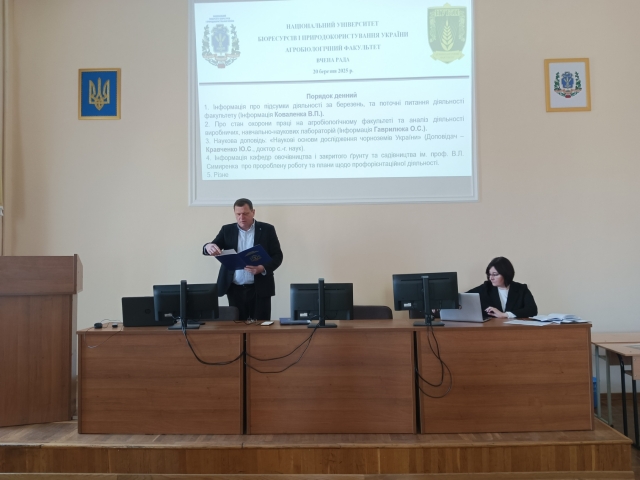 Декан Агробіологічного факультету Віталій Коваленко розпочав засідання вченої ради. Під час доповіді акцентував увагу про рівнонапруженість роботи кафедр факультету, якість проведення захисту курсових проектів бакалаврів на кафедрах, охарактеризував роботу по відкритих гостьових лекцій з представниками бізнесу і виробниками по кафедрах. До уваги присутніх була доведена інформація про профорієнтаційну діяльність факультету і підготовку до проведення Дня відкритих дверей.