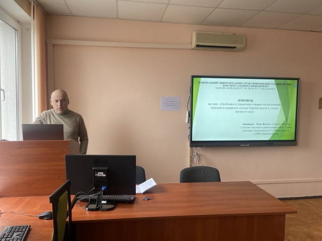 Здобувач вищої освіти ступеня доктора філософії зі спеціальності 073 Менеджмент Олег Білуха виступив з науковою доповіддю на тему: «Особливості управління товарно-матеріальними запасами в аграрному секторі України: реалії в умовах воєнного часу».