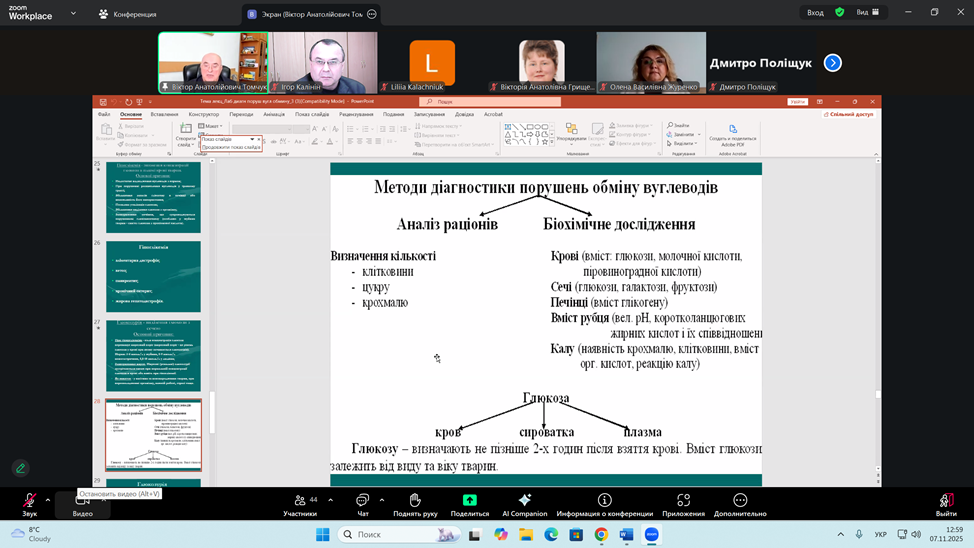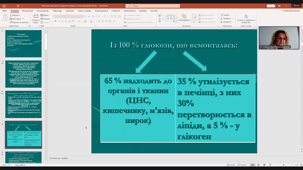 Викладач разом зі здобувачами вищої освіти на лекції обговорили питання щодо загальної характеристики вуглеводів, їх значення в обміні у тварин та лабораторну діагностику при розвитку різноманітних патологічних процесів.