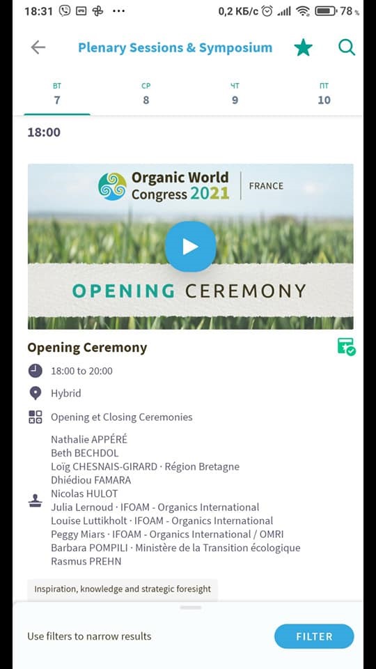 7 вересня 2021 р. відбулася урочиста церемонія відкриття Міжнародного Органічного Конгресу 2021 (OWC 2021). З вітальними словами до учасників звернулися провідні діячі Франції й міжнародних організацій, IFOAM. Вітання переважно звучали французькою мовою (хоча заявлена робоча мова – англійська).