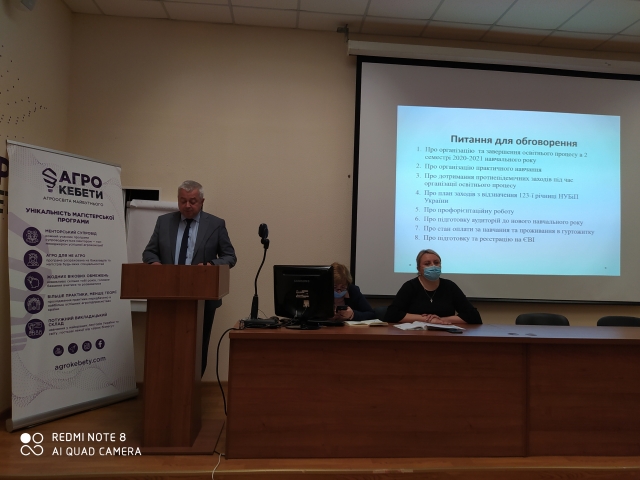 Декан закликав присутніх згуртуватися та активізувати роботу зі студентами, зокрема, щодо проведення екзаменів у період сесії, завершення випускових бакалаврських робіт, організації практики. Студенти та викладачі мають можливість зустрічатися у робочі дні та в суботу в аудиторіях, на кафедрах, а у разі сприятливих погодних умов – у так званих «екокласах», на свіжому повітрі. Актуальним лишається питання дотримання протиепідемічних заходів. Відповідна інструкція була озвучена всім присутнім та прийнята до виконання.