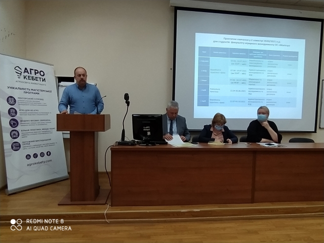Відповідальний секретар приймальної комісії від факультету аграрного менеджменту доцент Олександр Новак у своєму виступі привітав всіх з початком вступної кампанії та представив показники реєстрації студентів четвертого курсу на складання ЄВІ з іноземної мови, кількості поданих заяв на спеціальність 073 «Менеджмент» та 075 «Маркетинг» та повідомив, що приймальна комісія працює в очному режимі, а студентам надається необхідний супровід та допомога при реєстрації та подачі документів.