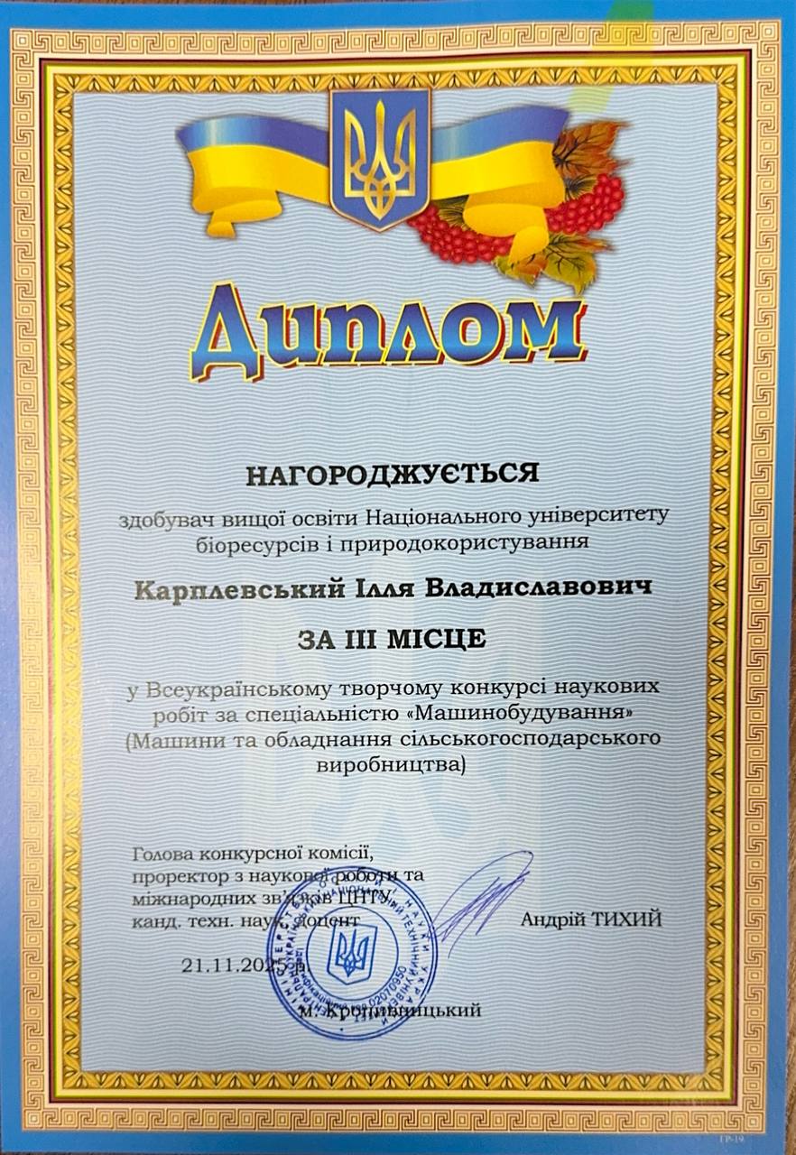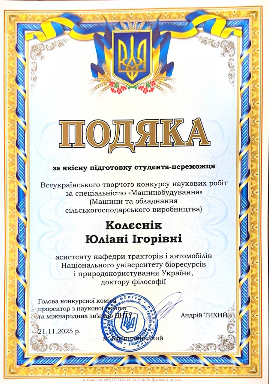 За рішенням конкурсної комісії ІІІ місце здобув Ілля КАРПЛЕВСЬКИЙ за роботу «Підвищення ефективності використання машинно-тракторних агрегатів шляхом застосування палив з модифікатором», виконану під керівництвом доктора філософії, асистента Юліани КОЛЄСНІК. Робота була відзначена високим науковим рівнем і практичною цінністю для транспортної та машинобудівної галузей.