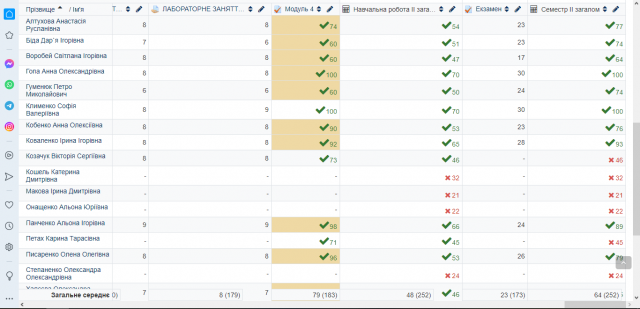 Академічна успішність студентів в цілому по курсу становить 83 %. Це студенти, які опанували викладені лекції, виконали завдання з лабораторних і самостійних робіт та успішно склали модулі. Інші 17 % студентів були недопущені до складання іспиту в зв’язку з невиконанням навчального плану.