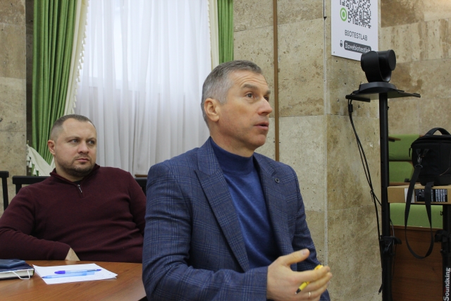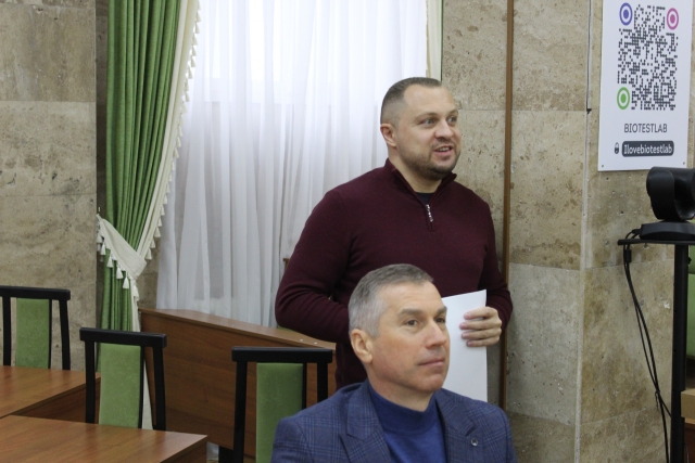 Генеральний директор ТОВ «ТД Біотестлаб» Сергій Семенов у своєму виступі відзначив, що приємно вражений змінами, які відбувається на факультеті і відмітив, що компанія завжди, із задоволення, підтримує факультет і його здобувачів, яких компанія працевлаштує у себе на сучасному біотехнологічному підприємстві ТОВ «Біотестлаб». Сергій Олександрович побажав кожному з учасників перемоги у представленні своїх робіт.