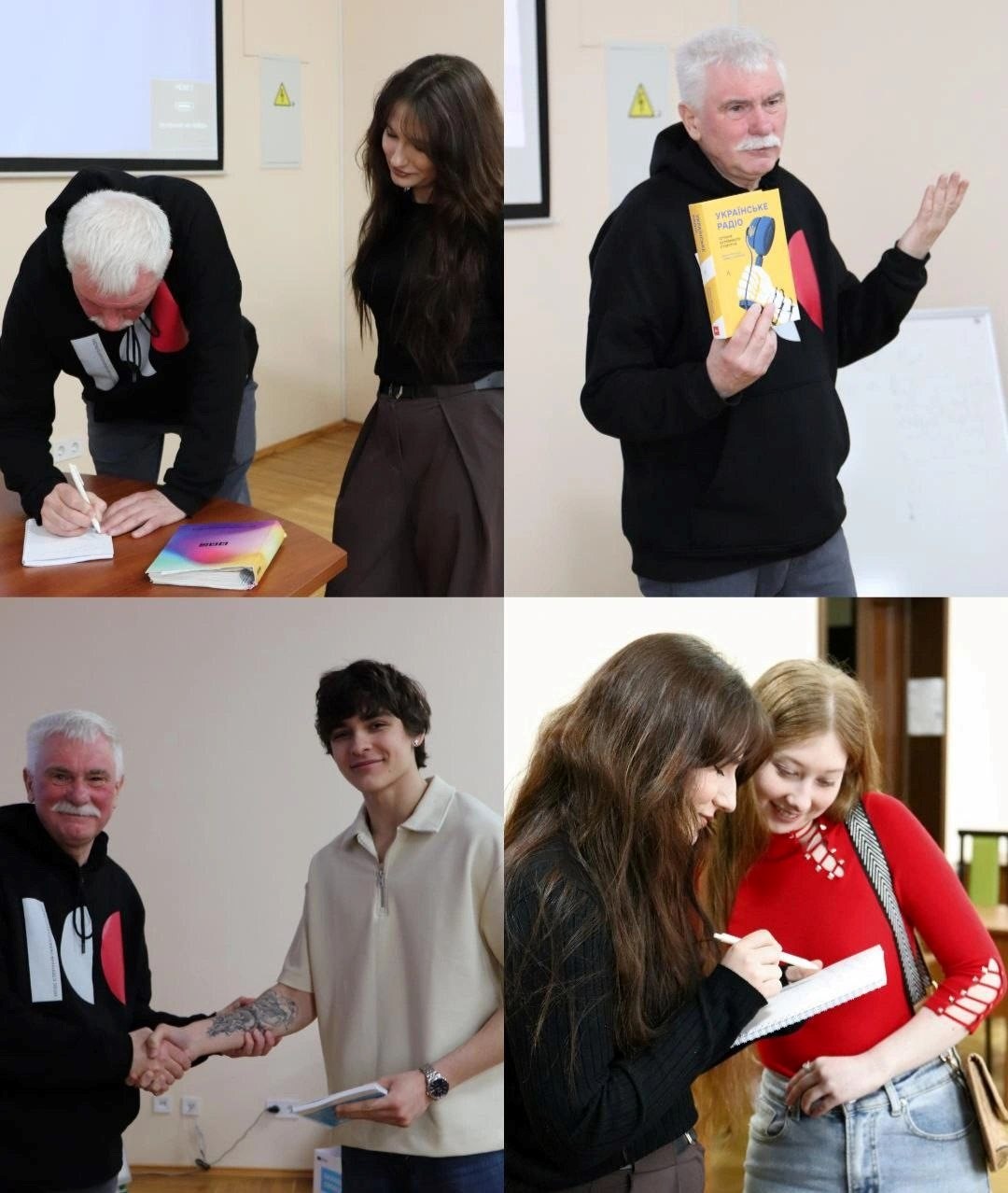 Студенти поставили лекторові багато питань, просили висловити свої пропозиції і побажання щодо удосконалення роботи студентських «Радіо 212» і телеканалу «Свій НУБіП». Найактивніші — Іванна, Ангеліна і Тарас — отримали символічні призи — чашку і блокноти з емблемами Суспільного Мовлення. А кафедрі журналістики та мовної комунікації В’ячеслав КОЗАК подарував книгу «Українське радіо»