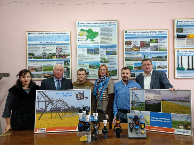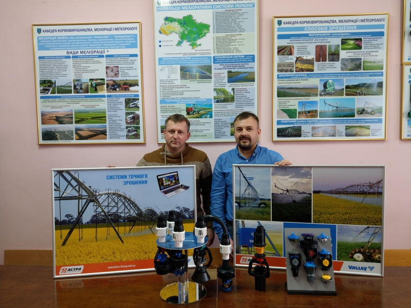 Значним подарунком студентам нашого університету, що вивчатимуть меліоративні дисципліни стало поповнення навчальної лабораторії кафедри кормовиробництва, меліорації і метеорології демонстраційними стендами найсучаснішого іригаційного обладнання. Ця подія відбулася завдяки співпраці завідувача кафедри, професора Григорія Демидася, доцента кафедри Віталія Коваленка та випускника 2002 року тоді ще агрономічного факультету Валентина Балицького, який зараз працює у компанії “АСТРА” – одному з найбільших постачальників та сервісних операторів сільськогосподарської техніки в Україні. Валентин Балицький є керівником проектів поширення технологій зрошення в Україні та безпосередньо займається введенням в експлуатацію зрошувальних комплексів Valley від провідного американського виробника. За словами фахівця ця техніка відрізняється від присутніх на ринку України аналогів надзвичайною якістю та висококваліфікованим інженерним супроводом (частка на світовому ринку цих систем становить 50 %). Фотографії, технічні характеристики та опис цих зрошувальних комплексів були представлені на подарованих стендах.