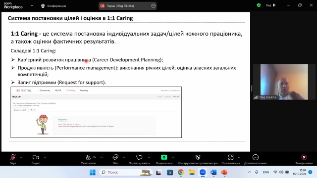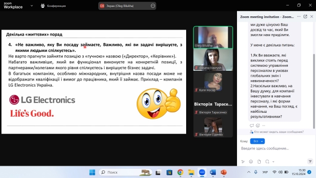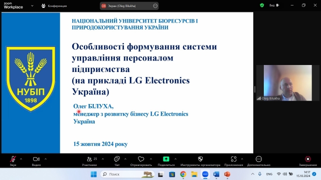 Для ознайомлення здобувачів вищої освіти з особливостями формування системи управління персоналом (на прикладі LG Electronics Україна), 15 жовтня 2024 року доцентом кафедри менеджменту ім. проф. Й. С. Завадського Оксаною Гавриш в межах діяльності студентського наукового гуртка «ДНК Лідера» була організована зустріч з Олегом Білухою, менеджером з розвитку бізнесу LG Electronics Україна.