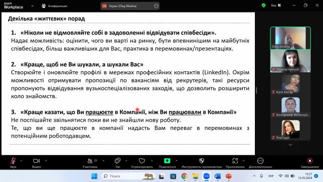 Наприкінці зустрічі Олег Білуха охарактеризував організацію роботи команди LG Electronics Україна в умовах воєнного стану, а також надав здобувачам вищої освіти «життєві» поради щодо працевлаштування та пошуку роботи, а саме: на що необхідно звернути увагу, як себе потрібно поводити на співбесідах, в яких мережах доцільно створювати профілі та ін.