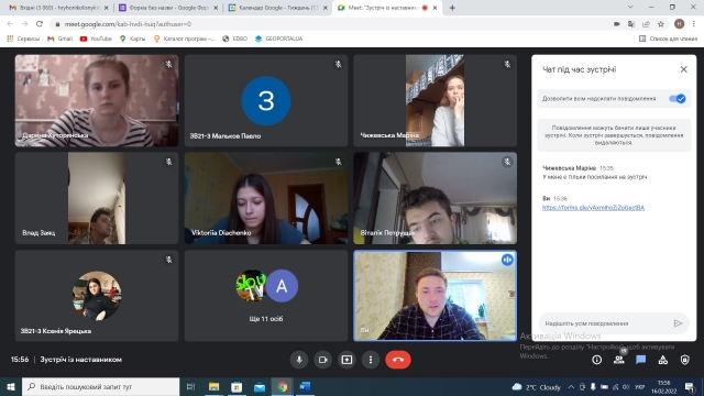 Керуй своїм розумом або він керуватиме тобою. Горацій Сьогодні, 16.02.2022, о 15.30 відбулась відеозустріч студентів 1 курсу 3 групи факультету землевпорядкування із наставником Колісник Г.М. Позитивним моментом для усіх стало збереження повною мірою складу групи, майже усі студенти завершили свій перший навчальний семестр без заборгованостей. Ключовими питаннями які були обговорені: активний початок 2 навчального семестру; відвідування занять та виконання практичних і самостійних робіт; забезпечення навчального процесу із ввімкненими камерами під час дистанційного навчання; Також куратором була проведена презентація про «Правило 5 секунд» Мело Роббінс, яке може допомогти трансформувати своє життя, роботу та впевненість за допомогою щоденної сміливості.